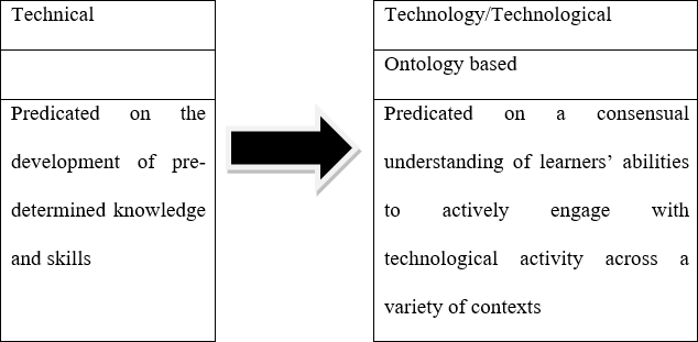 The role of technology education programmes in a school curriculum has been confusing due to diverse definitions of technological knowledge. Such confusion can be avoided by recognizing a recent paradigm shift in the perception of technology and technology education. International discourse and policy changes have shifted expectations from being technical to technological within education (Doyle et al., 2018). The difference lies in the philosophy and articulation of knowledge bases.