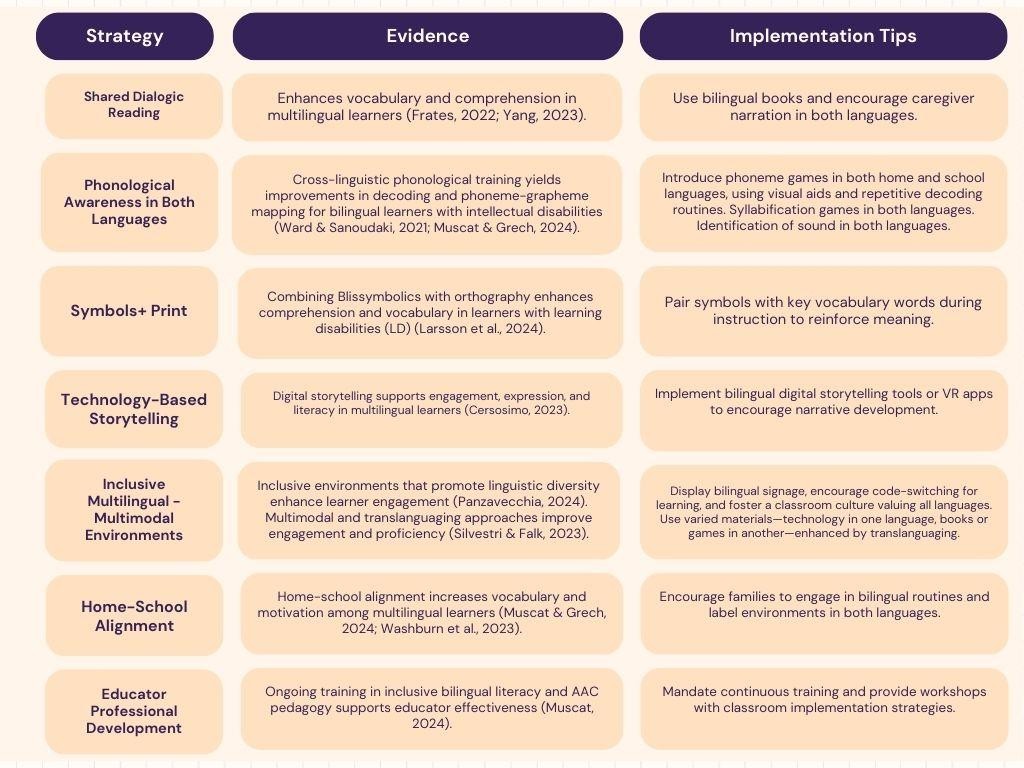 Based on empirical evidence and consistent with Maltese and international inclusion frameworks, the following strategies are proposed to enhance bilingual literacy instruction for learners with ID. These evidence-driven approaches recognise bilingual learners’ cognitive and communicative strengths while highlighting the importance of multimodal, adaptable, and context-aware instruction. Figure 1 summarises each strategy, its empirical foundation, and key implementation considerations.