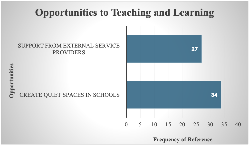 Quiet spaces: As illustrated in Figure 5, an idea that could support change outlined by questionnaire respondents regarding teaching and learning was the creation of quiet areas.